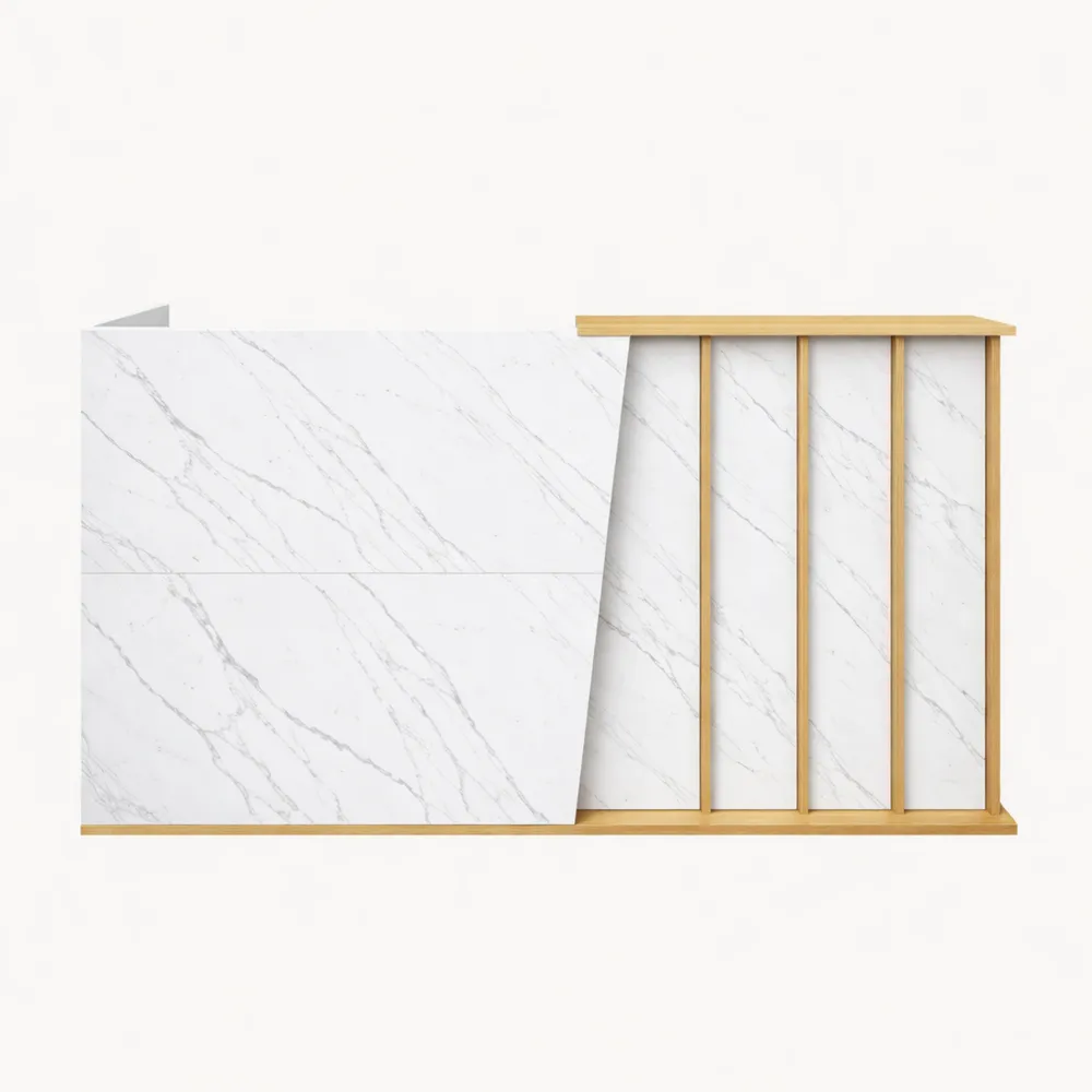 Reception multiuso: funziona come bancone del salone, reception dell'ufficio, bancone della hall dell'hotel o postazione cassa al dettaglio, offrendo uno spazio di lavoro funzionale per laptop e documenti.