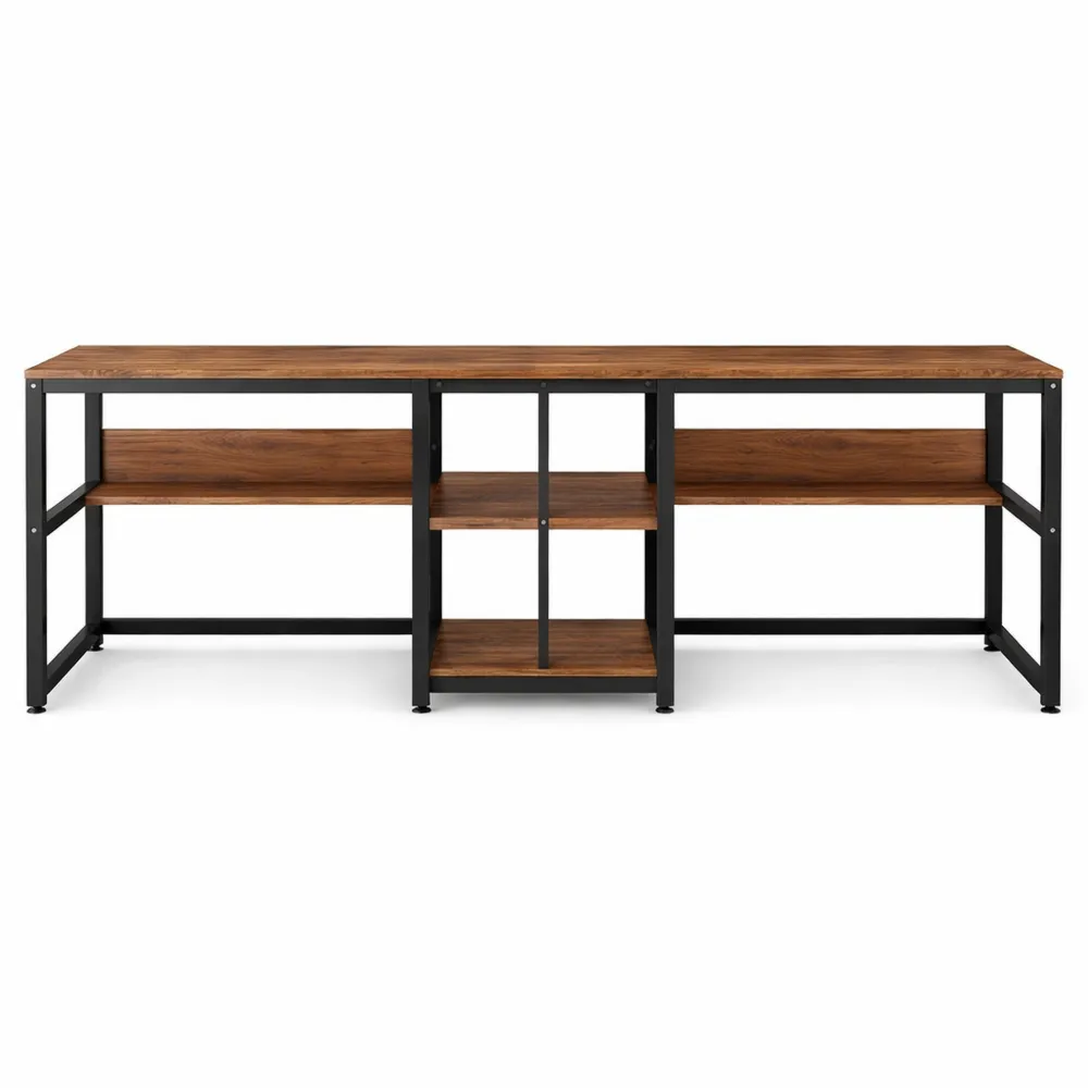 Banco da lavoro doppio adatto per ufficio, scuola o casa. La scrivania è progettata per due persone, favorendo la collaborazione senza compromettere lo spazio. Con una lunghezza di 198 cm, offre uno spazio di lavoro ampio e affiancato. Ha una superficie del desktop con un ripiano portaoggetti e una libreria inferiore per mantenere libri, laptop o accessori da ufficio organizzati e facilmente accessibili. Può essere utilizzata come scrivania per computer, tavolo da riunione o altro. Il design abbina una finitura rustica a elementi industriali, adattandosi a vari ambienti e mobili. Costruita in metallo resistente, garantisce stabilità e durata. I piedini regolabili permettono di adattarsi a superfici irregolari migliorando la stabilità complessiva. La scrivania è dotata di scaffali aperti per riporre gli oggetti essenziali per ufficio, mantenendo tutto a portata di mano. Realizzata con pannelli truciolari e un telaio in acciaio, offre qualità e robustezza. Piedi regolabili proteggono il pavimento dai graffi e permettono di stabilizzare la scrivania su pavimenti irregolari.