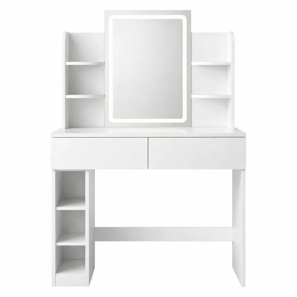 Questa cassettiera presenta una striscia luminosa a LED incorporata, con controllo al tocco per l'accensione e la regolazione del colore e della luminosità. Dispone di tre variazioni di temperatura di colore: calda, naturale e fredda. La superficie del tavolo misura 90x40x135 cm e offre ampio spazio di archiviazione con 2 cassetti, 4 scomparti aperti sopra e 2 sotto. Realizzato in truciolato, assicura resistenza e facilità di pulizia. Il design minimalista bianco con linee pulite e strisce luminose integrate si adatta a qualsiasi ambiente.