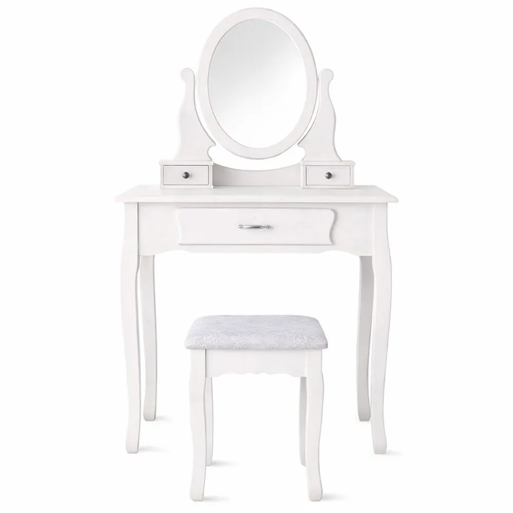 Specchio ovale con inclinazione regolabile: offre visibilità durante il trucco e l'applicazione di gioielli. Permette regolazioni per diverse necessità visive. Protezione antiribaltamento: il tavolo è dotato di un sistema che consente un fissaggio sicuro a parete. Design flessibile 2 in 1: utilizzabile come tavolo da toeletta o come scrivania, regolabile secondo necessità. Spazio di archiviazione: il cassetto grande e due scomparti offrono spazio per accessori cosmetici, mentre il piano del tavolo fornisce ulteriore area per oggetti d'uso frequente. Facile da mantenere: la superficie è resistente alle macchie e agli urti, pulibile con un panno umido.